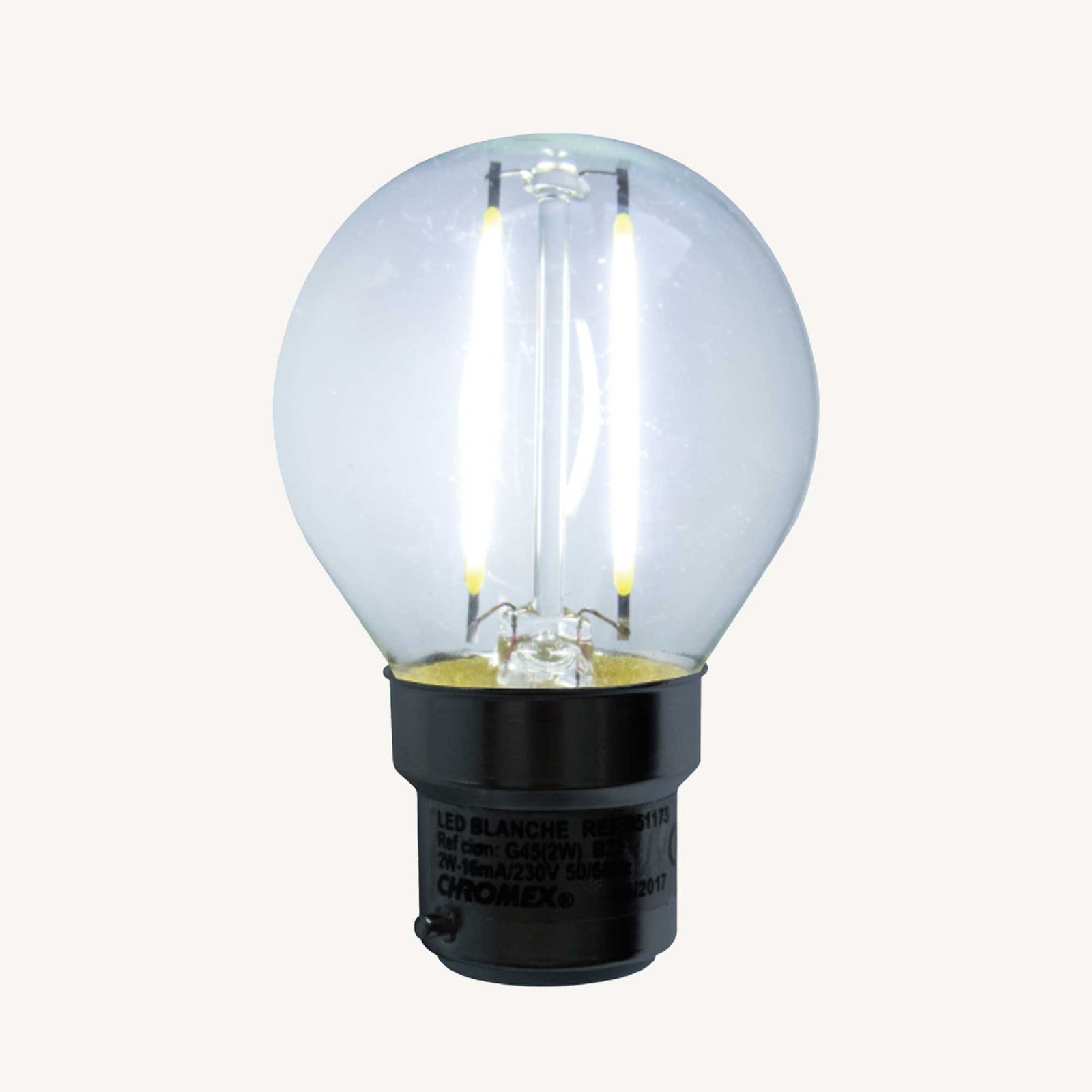 Ampoule B22, fabriquée en verre. Ampoule composée de 2 LED filaments.