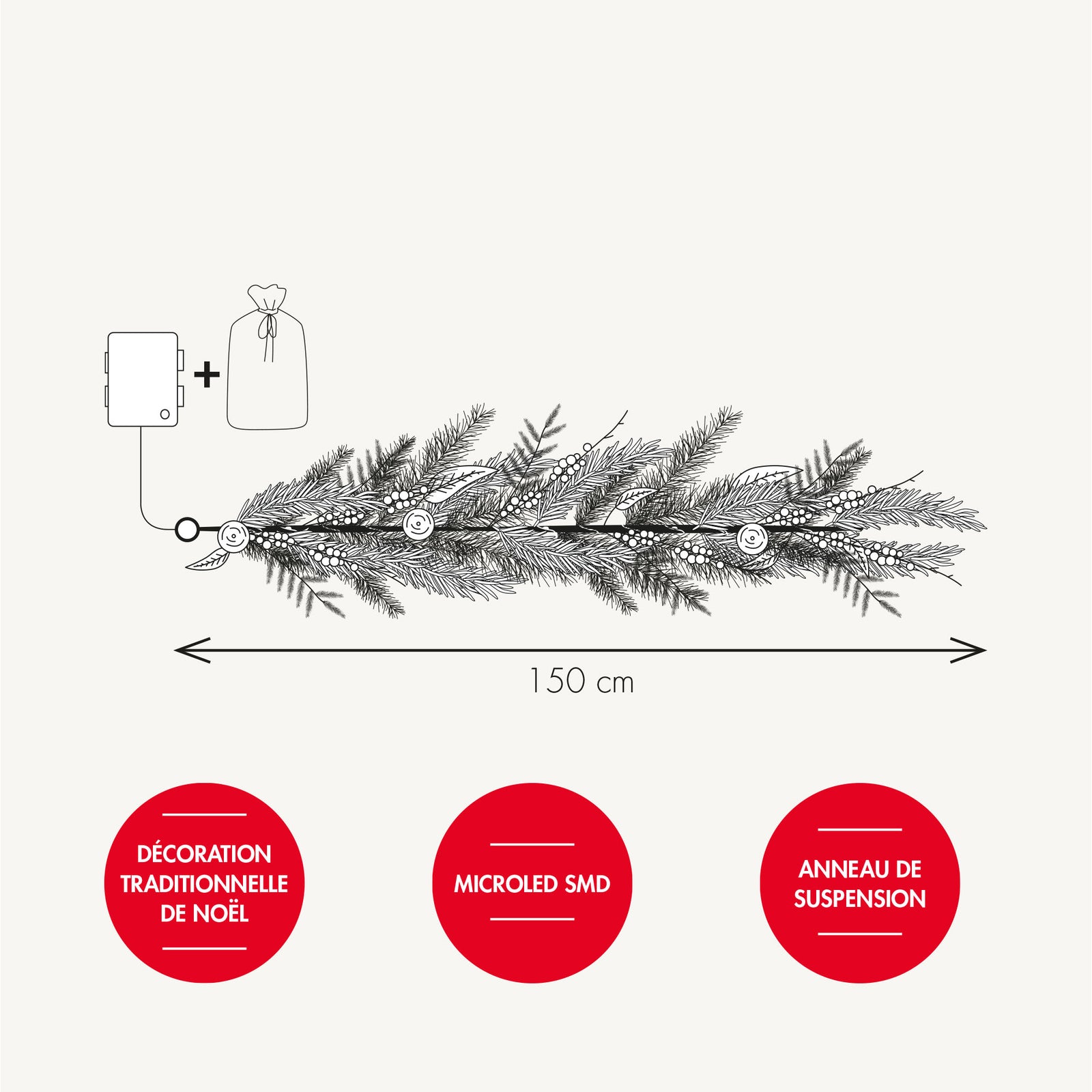 Cette guirlande branche lumineuse mesure 1.5m. Elle est dotée d'un anneau de fixation. Elle fonctionne avec 3 piles AA 1,5V non fournies. Le boitier de piles est adapté à une utilisation extérieure.