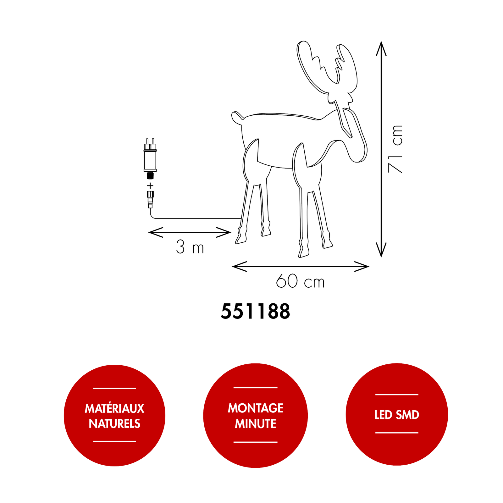 L'élan mesure 71cm de hauteur et 60cm de large. La longueur de câble entre le transformateur et l'élan est de 3 m.