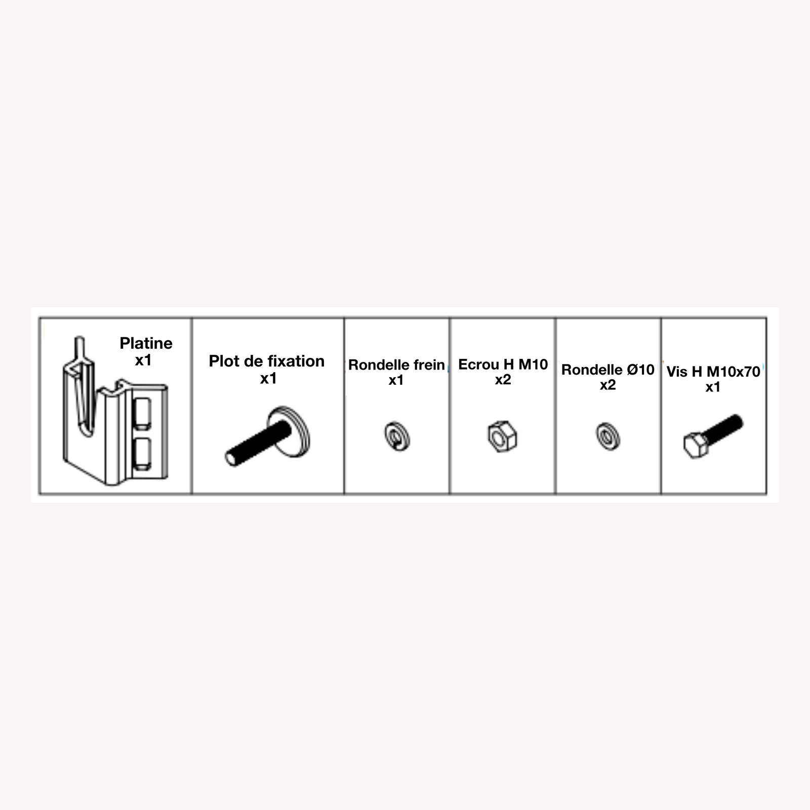 Ce pack comprend ; Une platine, un plot de fixation, une rondelle frein, deux écrous, une vis, deux rondelles.