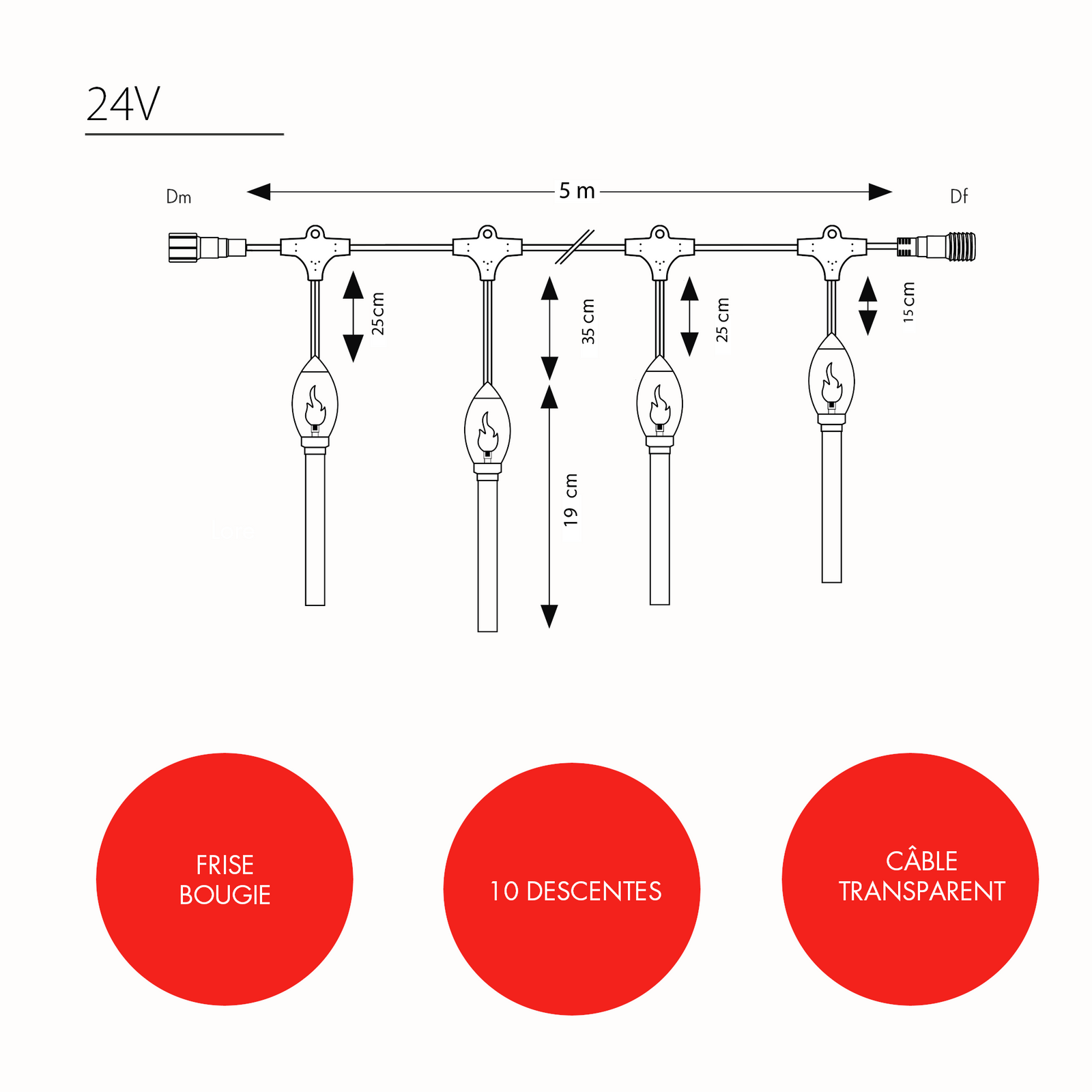 Cette frise est composée de 10 descentes de bougies suspendues. Elle est prolongeable jusqu'à 1+6 produits maximum (soit 35m). Elle est vendue sans son câble d'alimentation, prévoir une alimentation référence 032371 et un transformateur (à choisir en fonction des Watt). Il n'est pas prolongeable mais il est connectable et compatible avec nos connecteurs D Plug & Light 24V.
