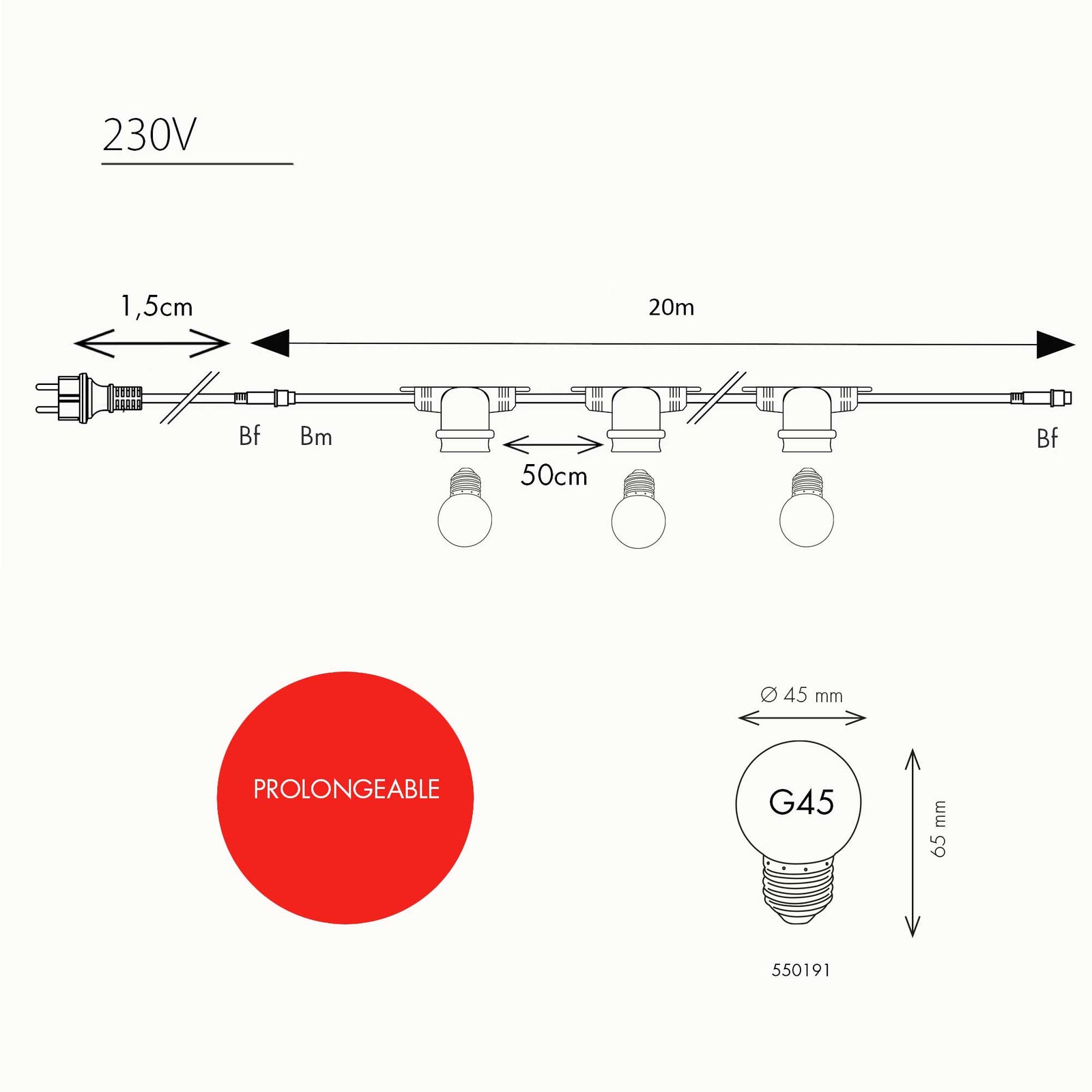 Ce kit est composé de la guirlande guinguette Festival 551077 et de 12 lots d'ampoules 550191 soit 24 ampoules rouges, 12 ampoules jaunes, 12 ampoules vertes et 12 ampoules bleues, douille E27 forme G45. C'est à vous d'assembler les ampoules. Sa puissance est de 30W. La guirlande mesure 20m, elle est prolongeable jusqu'à 100m. Elle est vendue avec des ampoules. Son câble est blanc. Chaque douille est équipée d'un joint d'étanchéité et supporte 15W.