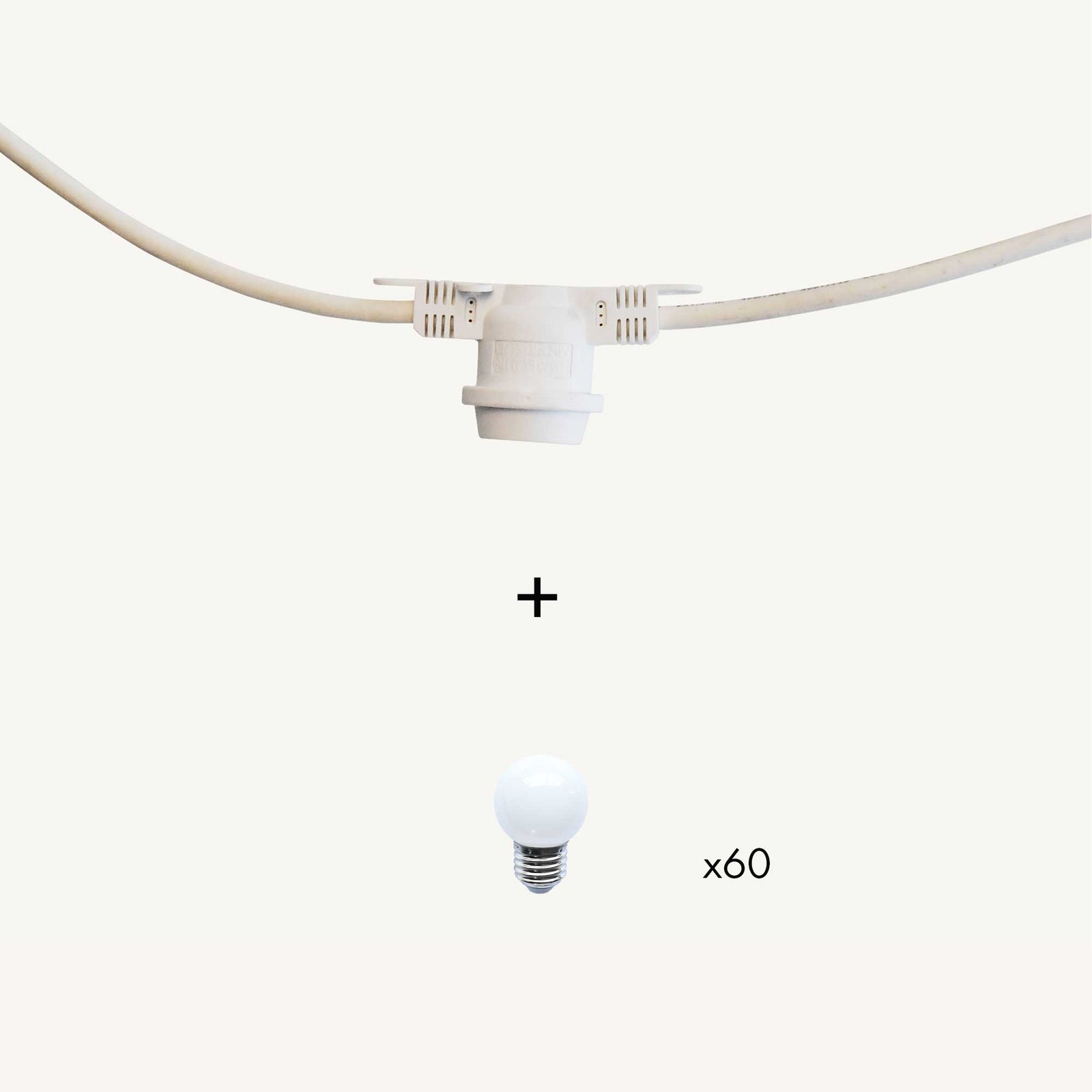 Ce kit est composé de la guirlande guinguette Festival 551077 et de 12 lots d'ampoules 550190 soit 60 ampoules blanc chaud, douille E27 forme G45. C'est à vous d'assembler les ampoules. Sa puissance est de 30W. La guirlande mesure 20m, elle est prolongeable jusqu'à 100m. Elle est vendue avec des ampoules. Son câble est blanc. Chaque douille est équipée d'un joint d'étanchéité et supporte 15W.