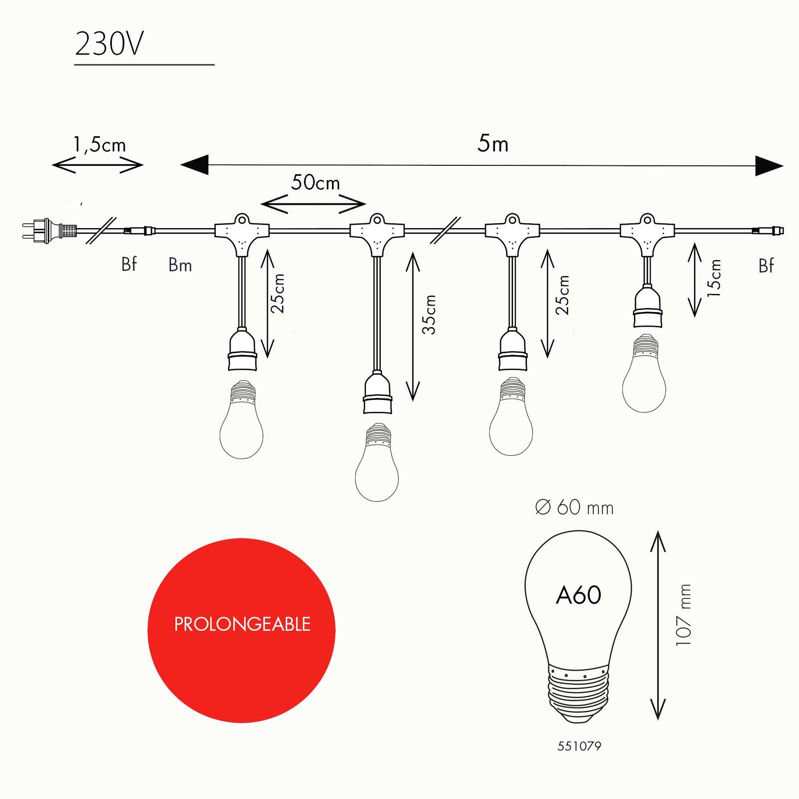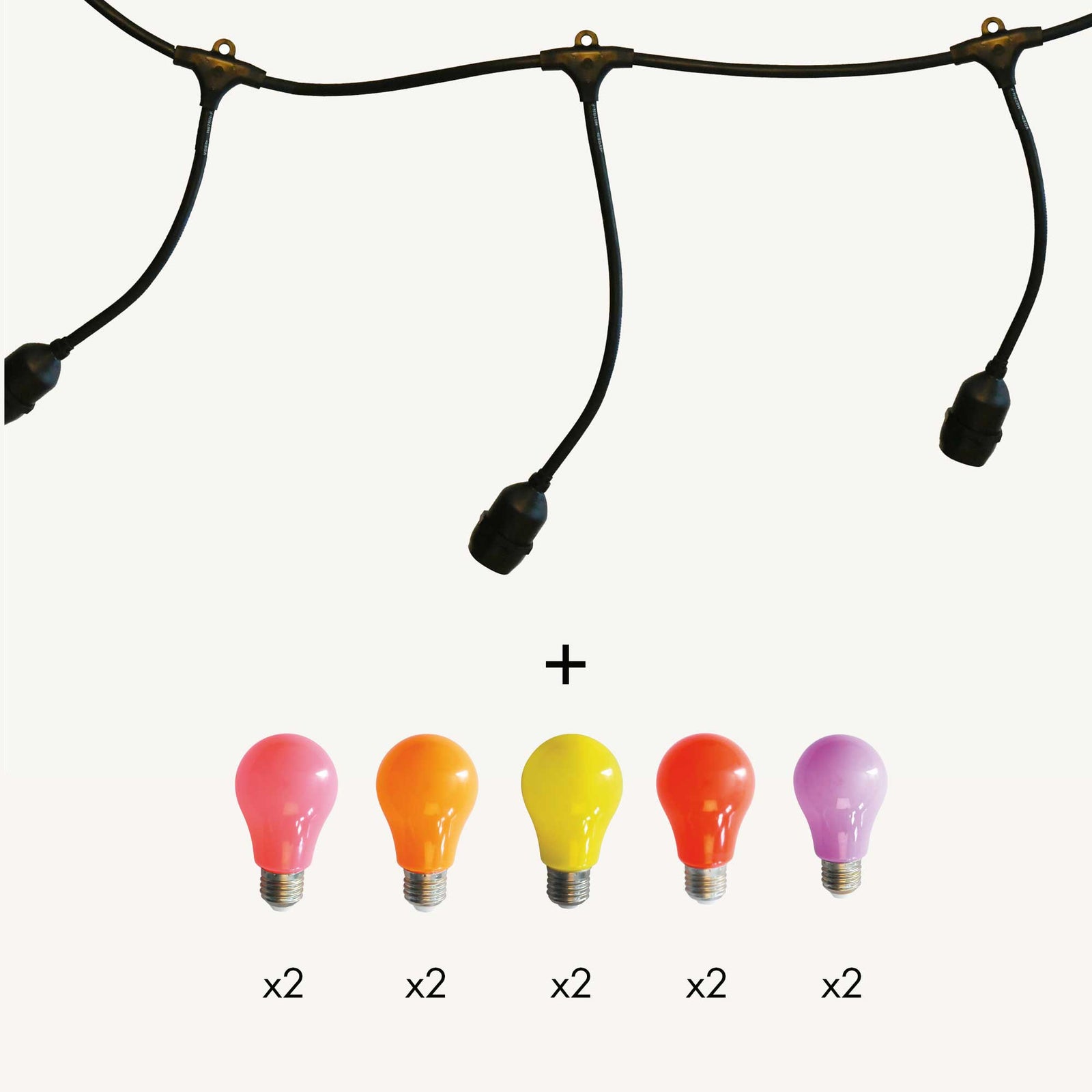 Ce kit est composé de la guirlande 551075 et de 2 lots d'ampoules 551079 soit 10 ampoules de couleurs chaudes (2 jaunes, 2 oranges, 2 roses, 2 rouges, 2 violettes) douille E27 forme A60. C'est à vous d'assembler les ampoules. Sa puissance est de 25W. La guirlande mesure 5m, elle est prolongeable jusqu'à 100m. Elle est vendue avec des ampoules. Son câble est noir. Chaque douille est équipée d'un joint d'étanchéité et supporte 15W. Il y a 3 mesures de descentes différentes et chaque descente contient un anneau de fixation.
