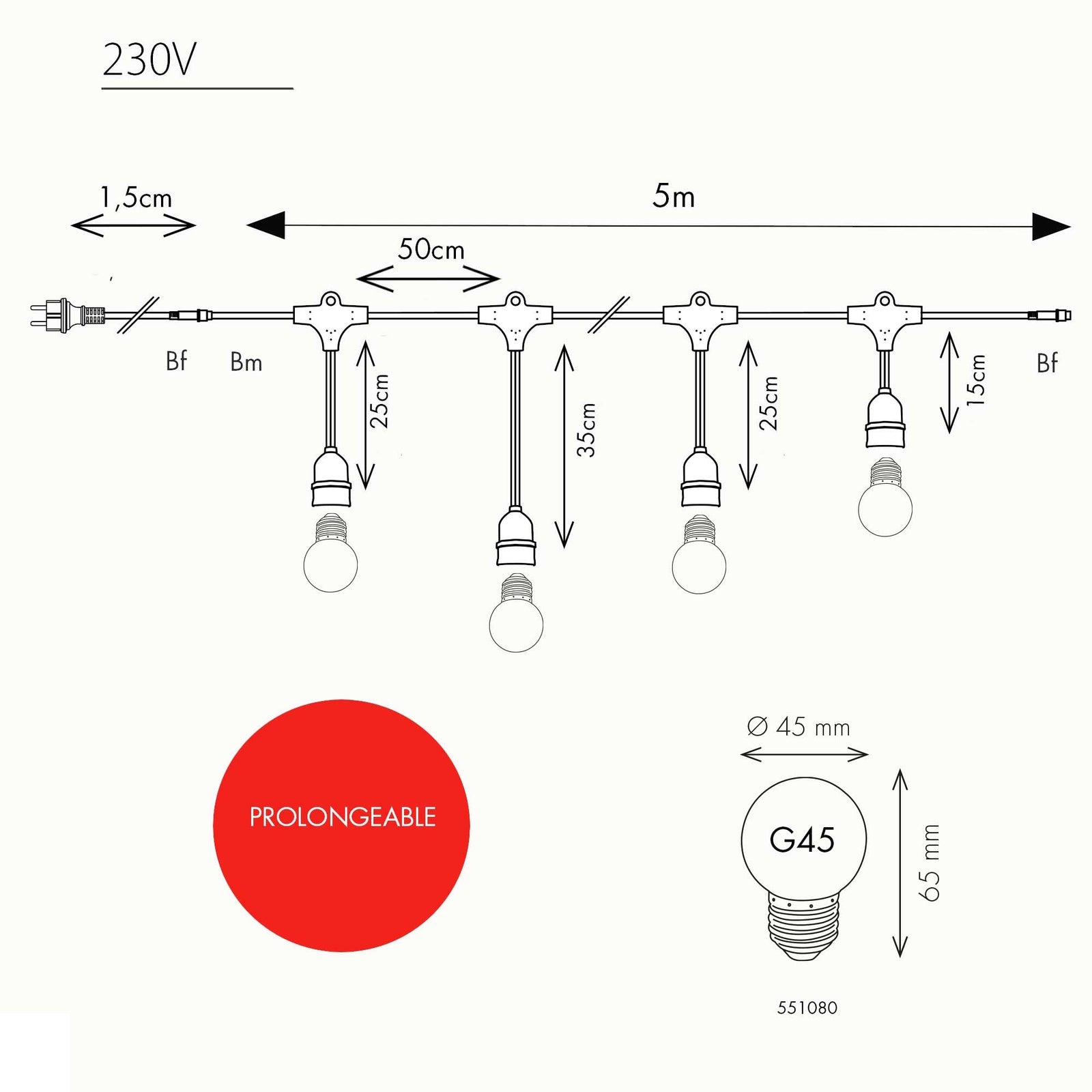 Ce kit est composé de la guirlande 551075 et de 2 lots d'ampoules 551080 (soit 2 ampoules jaunes, 2 oranges, 2 rouges, 2 violettes et 2 roses) douille E27 forme G45. C'est à vous d'assembler les ampoules. Sa puissance est de 25W. La guirlande mesure 5m, elle est prolongeable jusqu'à 100m. Elle est vendue avec des ampoules. Son câble est noir. Chaque douille est équipée d'un joint d'étanchéité et supporte 15W. Il y a 3 mesures de descentes différentes et chaque descente contient un anneau de fixation.