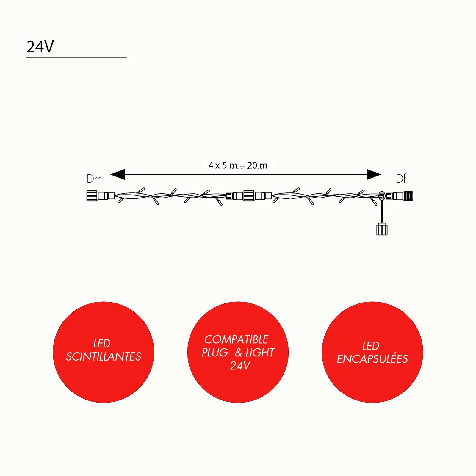 Cette guirlande de 20m est prolongeable jusqu'à 80m. Elle est vendue sans son câble d'alimentation. Il faut donc prévoir une alimentation référence 032371 et un transformateur 24V (à choisir en fonction des Watt) ref 061218 (30W) - ref 061219 (60W). Cette guirlande est compatible avec nos connecteurs D Plug & Light 24V.