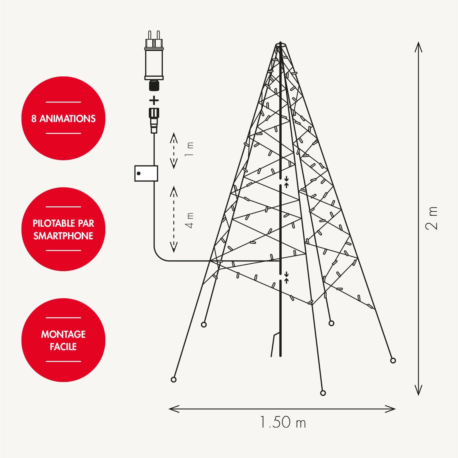 Ce magnifique cône lumineux enchanté est simple d'installation. Dotée de l'indice de protection IP44, Il résistera à toutes les météos. Simple d'utilisation, il vous suffit de brancher à une prise secteur grâce au câble de 5m inclus.