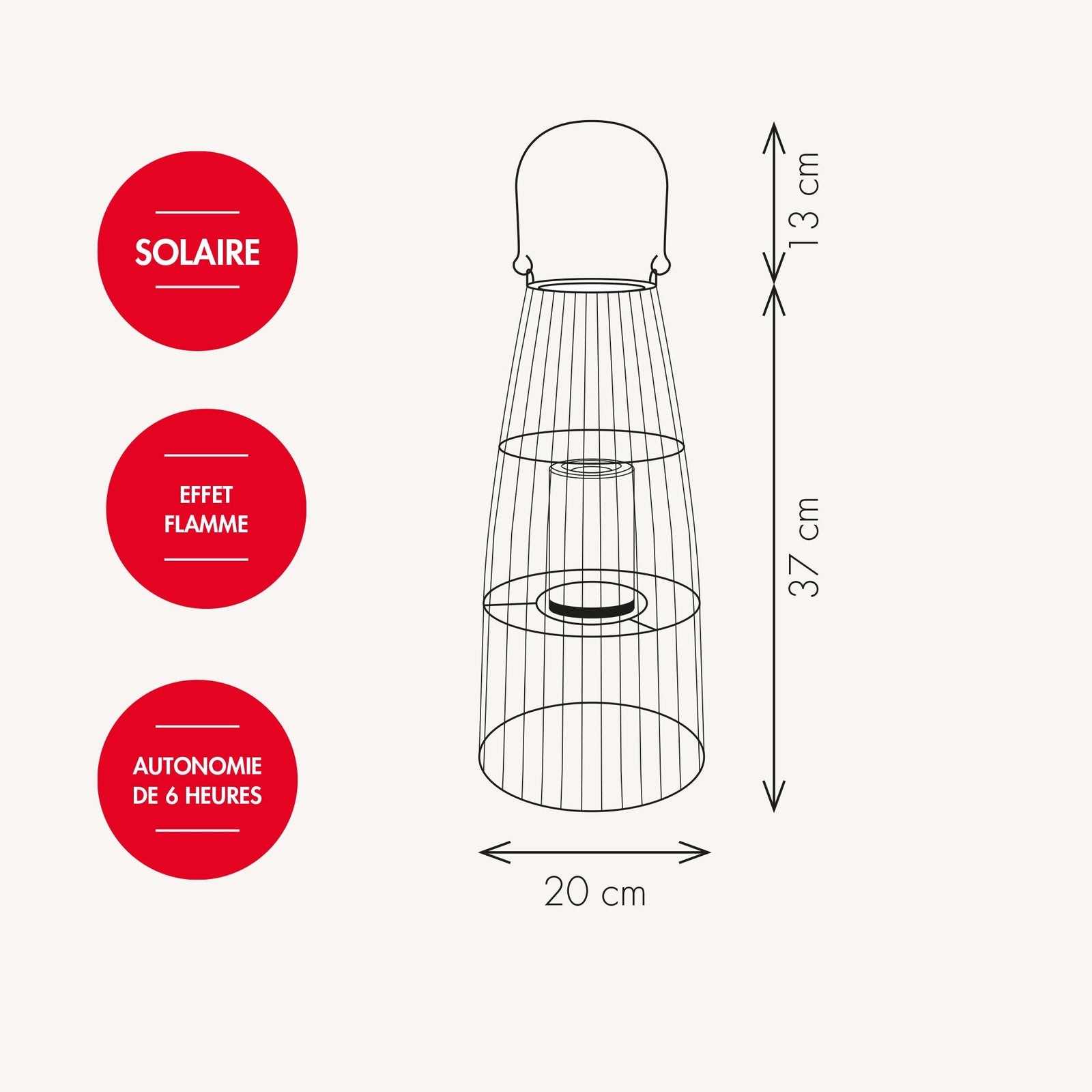 Cette lanterne mesure 37cm de hauteur et 20cm de largeur. Sa bougie est amovible, vous avez juste à déviser pour l'enlever. Elle contient une batterie solaire rechargeable. De plus, la matière en fer peint garantit la solidité de votre lanterne.
