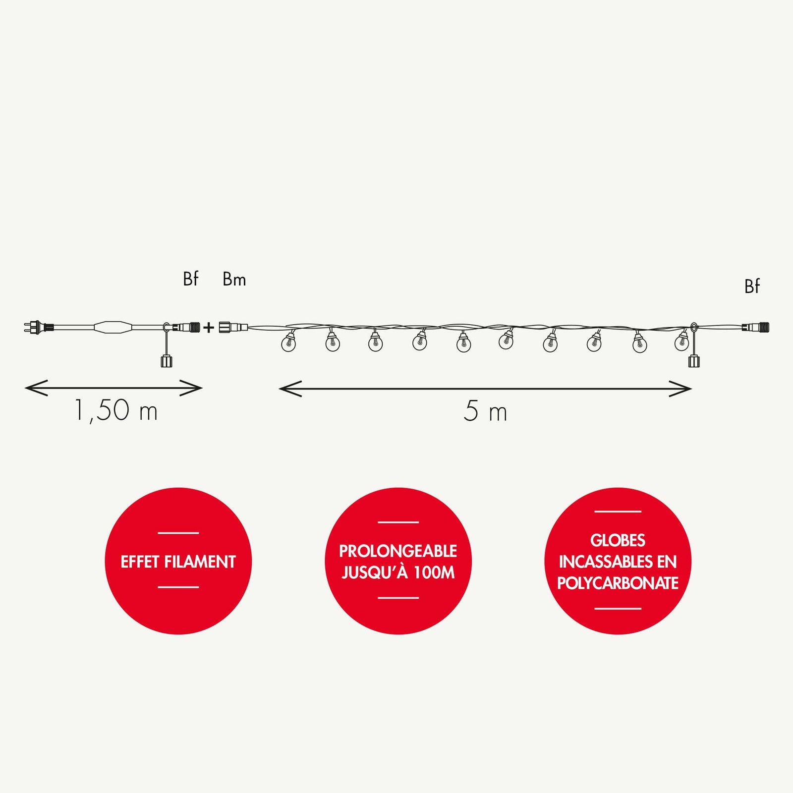 La guirlande est connectable jusqu'à 100m, vous pourrez éclairer une grande surface. Les globes incassables en polycarbonate, le cordon en caoutchouc et l'indice IP44 de cette guirlande lumineuse assurent une étanchéité tout au long de l'année.