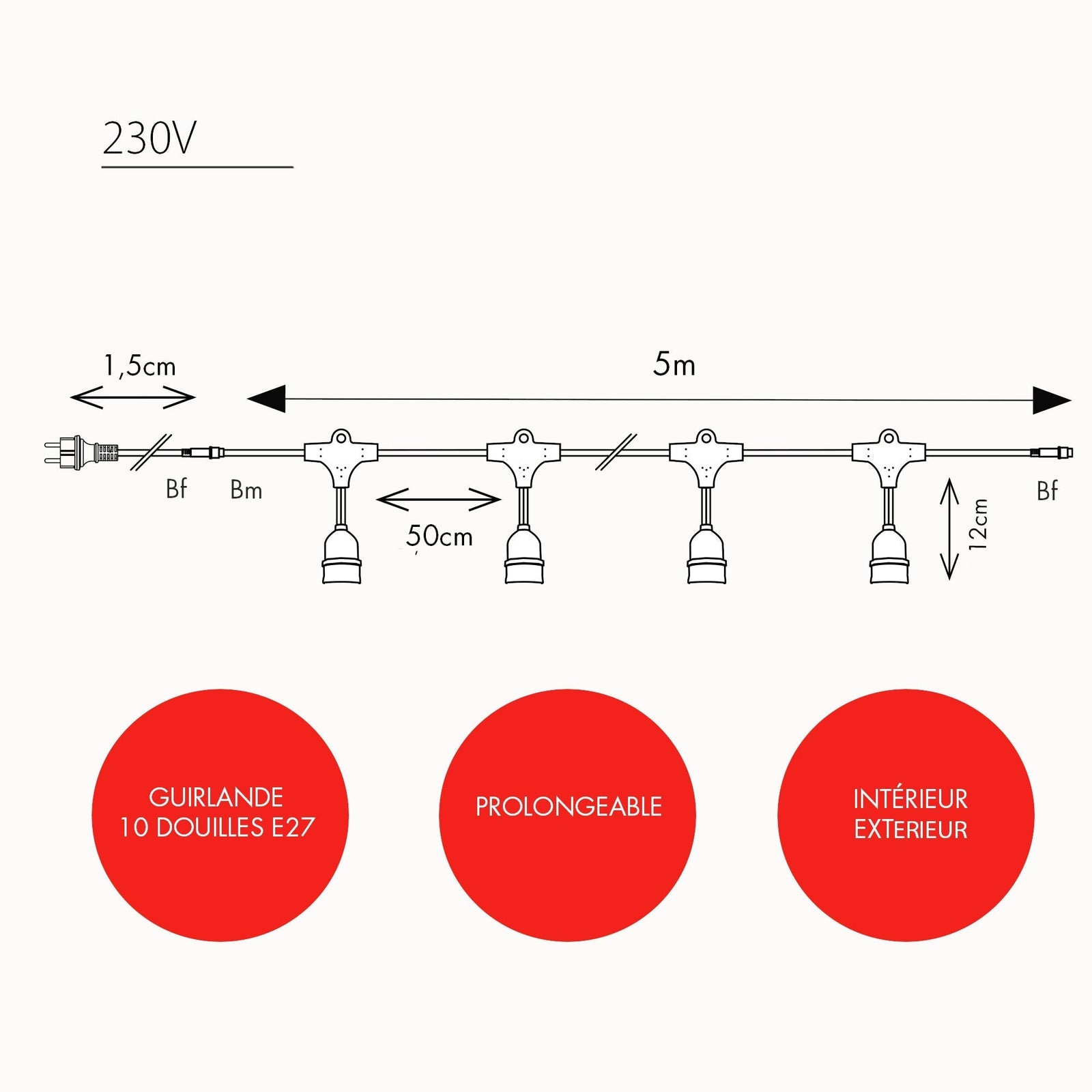 Cette guirlande mesure 5m. Elle est prolongeable jusqu'a 100m. Elle est vendue sans ses ampoules. La guirlande supporte 15W maximum par douille.
