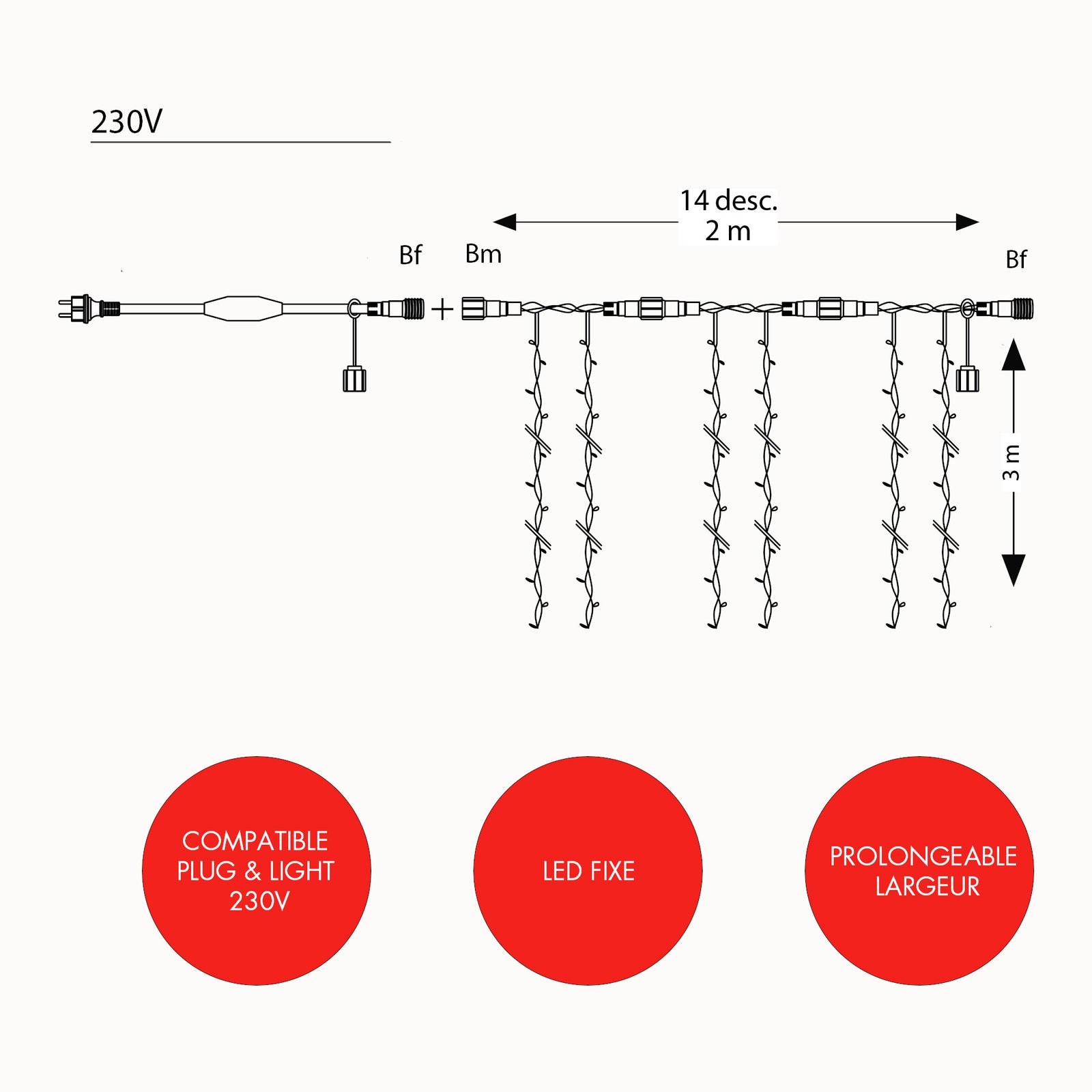 Ce rideau est composé de 15 descentes. Il est prolongeable jusqu'à 1+27 produits en largeur maximum. Il est vendu avec son câble d'alimentation. Ce rideau est compatible avec nos connecteurs B Plug & Light 230V.