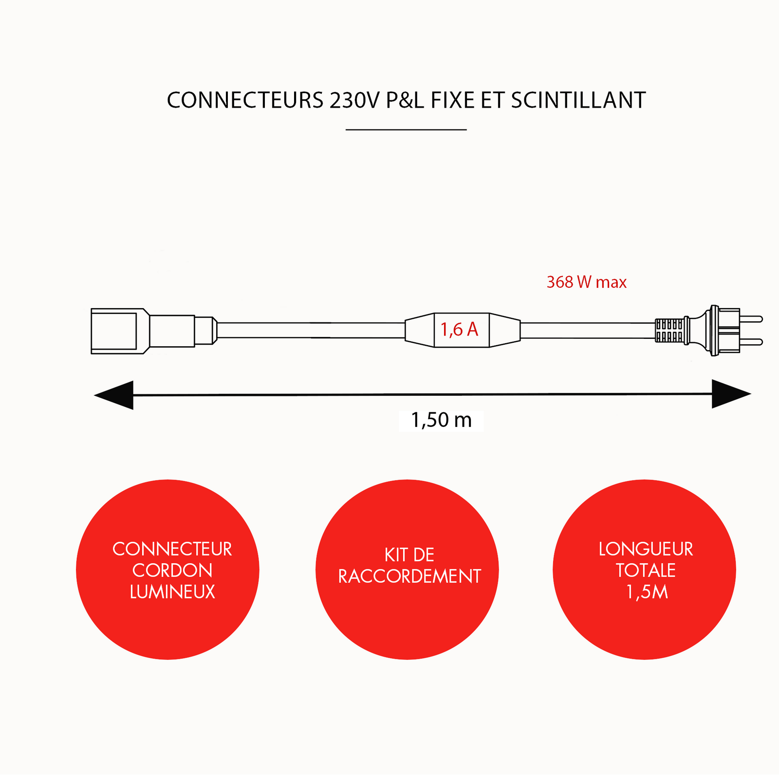 Kit de raccordement et d'alimentation uniquement compatible avec les cordons lumineux Sur'line ne disposant pas de prise secteur 230V. Cordon lumineux à la coupe.