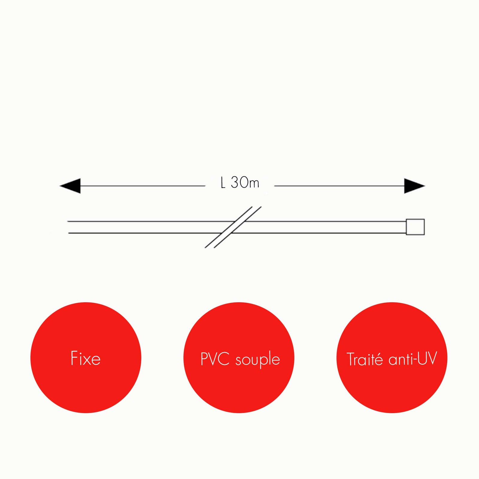 Ce cordon lumineux de 30m est sécable tous les 1,5m. Il est vendu sans son câble d'alimentation. Il faut donc prévoir une alimentation référence 032371 et un transformateur 061219 ou 061219 (à choisir en fonction des Watt)Ce cordon est compatible avec nos connecteurs D Plug & Light 24V.