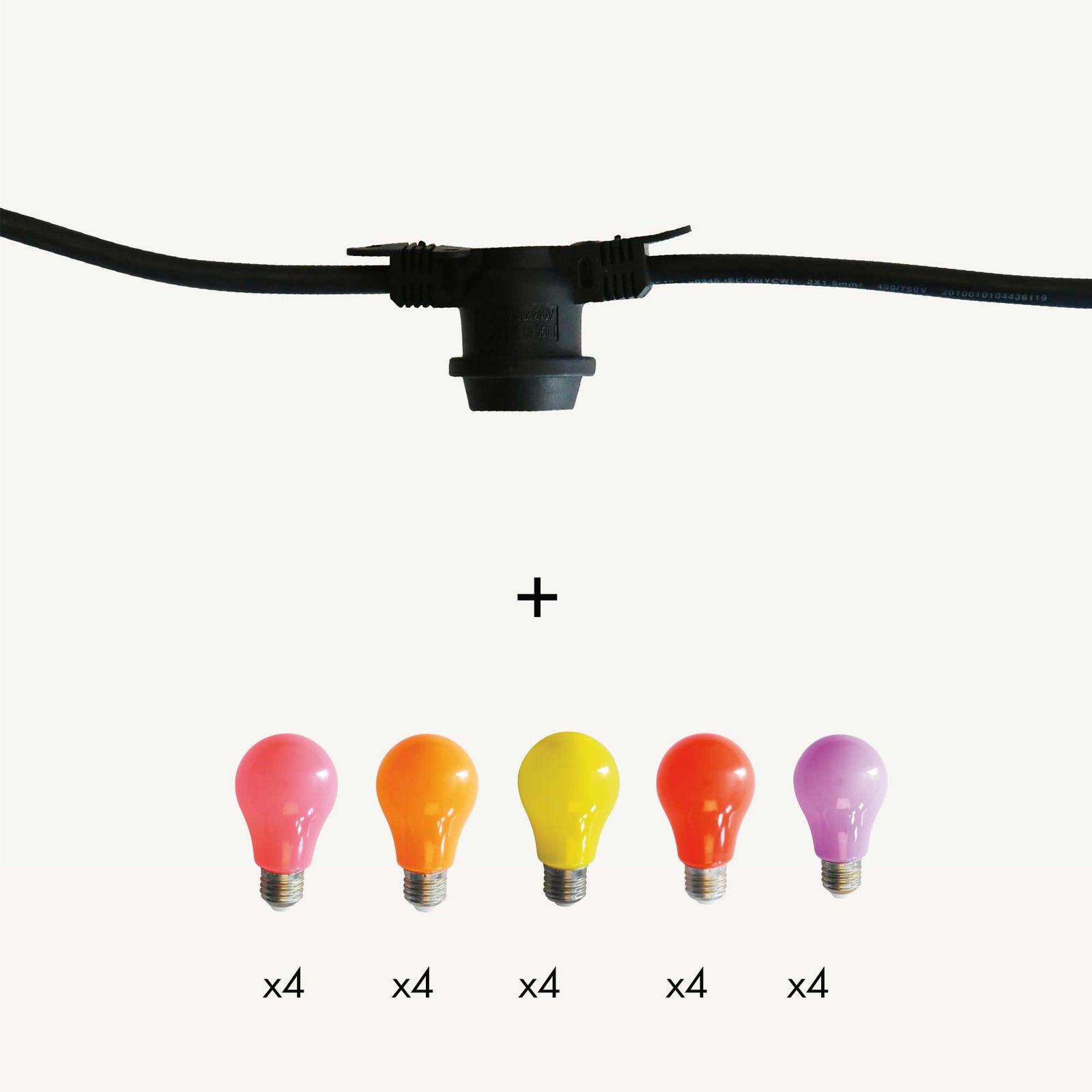 Ce kit est composé de la guirlande guinguette Festival 551073 et de 4 lots d'ampoules 551079 soit 4 ampoules jaunes, 4 oranges, 4 rouges, 4 violettes et 4 roses, douille E27 forme A60. C'est à vous d'assembler les ampoules. Sa puissance est de 50W. La guirlande mesure 10m, elle est prolongeable jusqu'à 100m. Elle est vendue avec des ampoules. Son câble est noir. Chaque douille est équipée d'un joint d'étanchéité et supporte 15W.
