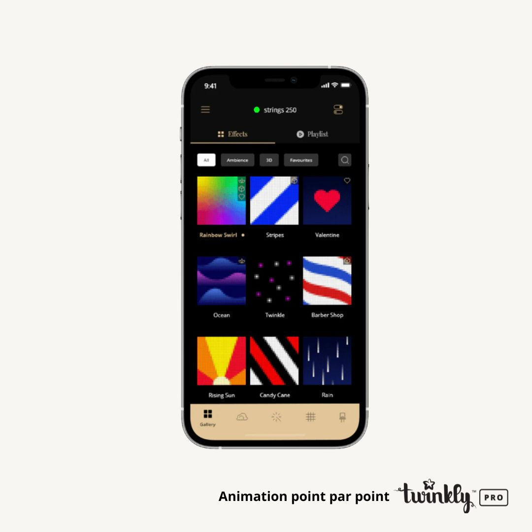 • Animation : Animation point par point par application Twinkly (uniquement sur iOS)