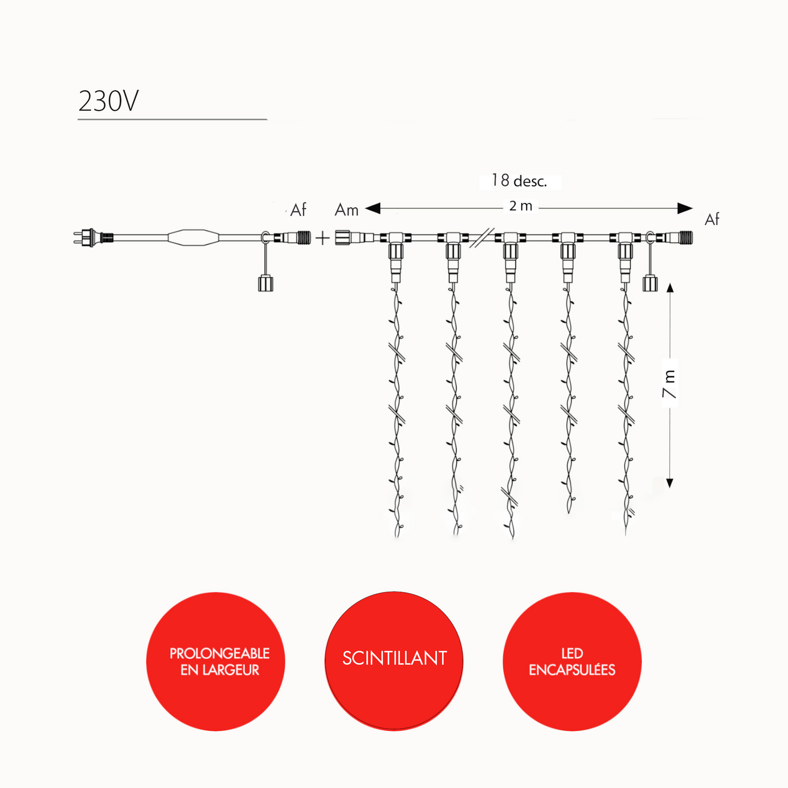 Ce rideau est composé de 18 descentes. Il est prolongeable jusqu'à 1+2 produit en largeur. Il est vendu avec son câble d'alimentation. Ce rideau est compatible avec nos connecteurs A Plug & Light 230V.