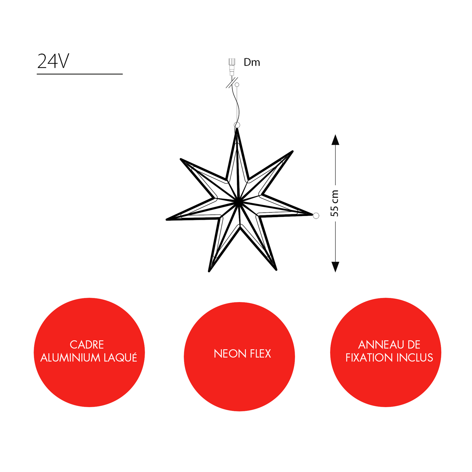 La structure de cette étoile 3D est en aluminium laqué Or. Cette suspension est vendue sans son câble d'alimentation. Il faut donc prévoir une alimentation référence 032371 et un transformateur (à choisir en fonction des Watt) : 061218 (30W) ou 061219 (60W). Cette sphère est compatible avec nos connecteurs D Plug & Light 24V. Structure aluminium pliable et câble renforcé. Vous pouvez assembler plusieurs sphères en utilisant un connecteur en T (après transformateur) référence 032367 (blanc) ou 550471 (or). Ne pas dépasser 80m de fil maximum entre le 1er et dernier produit.